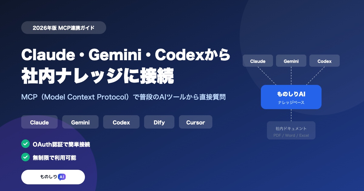 ものしりAIのMCP(Model Context Protocol)機能を使って、Claude Desktop・Claude.ai・Gemini CLI・Codex・Dify・Cursorから社内ナレッジに接続する方法を解説します。